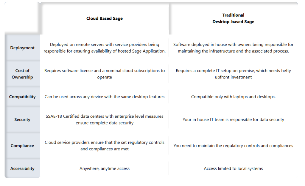 The fundamental difference between standalone desktop-based accounting and hosted Sage applications is the way the software is deployed and where it resides. Traditionally, Sage applications were installed locally on office desktops with internal IT teams being responsible to manage the tech operations while cloud-based Sage applications are installed on the cloud service provider’s servers and accessed remotely through RDP (Remote Desktop Protocol).